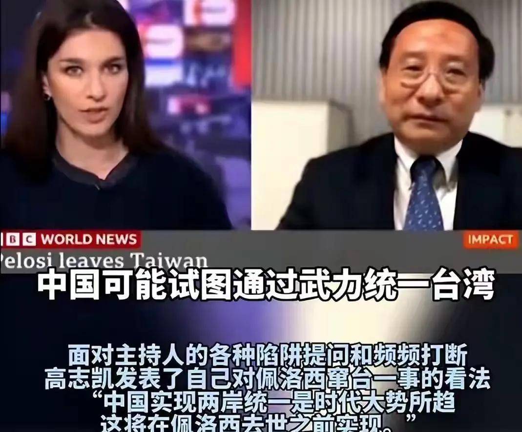 在当天专访中,BBC记者雅尔达·哈基姆故意诘难高志凯,还恶意频频给高志凯设置陷阱,还一再抢话,可是高志凯的回答柔中有刚,充满智慧:“请允许我强调一件事:海峡两岸必然统一,这是我们这个时代的大势所趋,而且这会在佩洛西去世之前实现。”