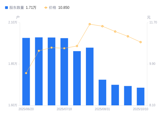 近一年(2024年10月10日至2025年10月10日),凯发电气A股股东户数从2.33万户,减低至1.71万户,降幅26.77%,区间股价下跌9.82%。