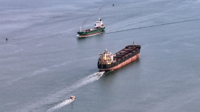 这是穿行在茅尾海海域的海轮,往来钦州港装运货物(9月16日摄,无人机照片)。