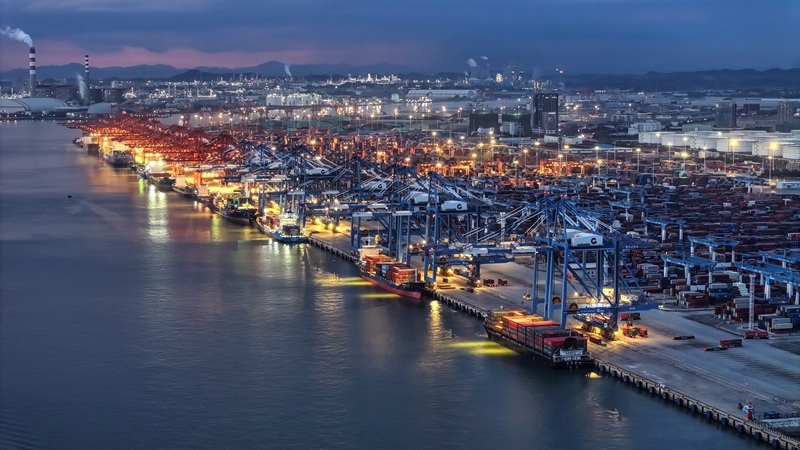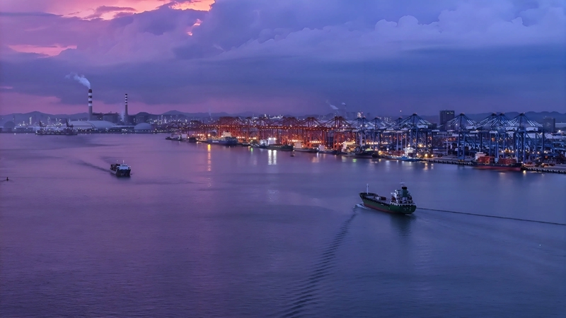 这是黄昏时分的钦州港,海轮往来穿行运输货物(9月16日摄,无人机照片)。