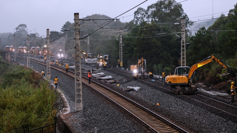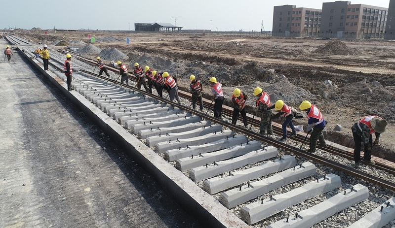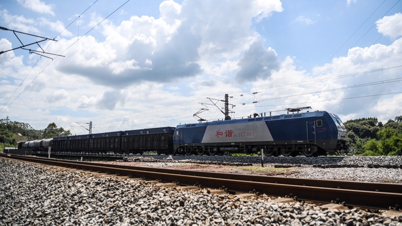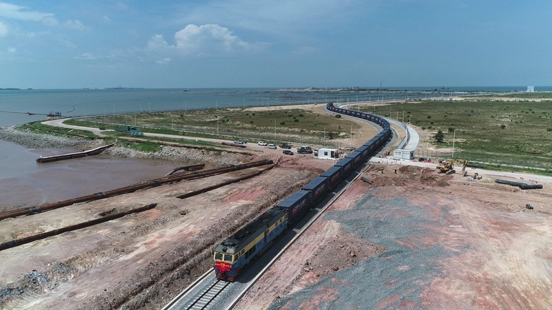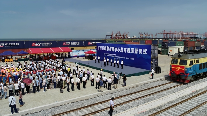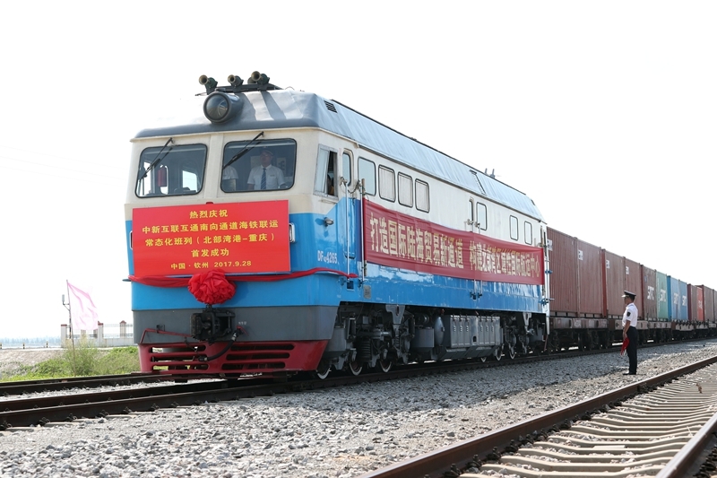 这是中新互联互通南向通道铁海联运常态化班列(北部湾—重庆)在钦州港东站首发(2017年9月28日摄)。