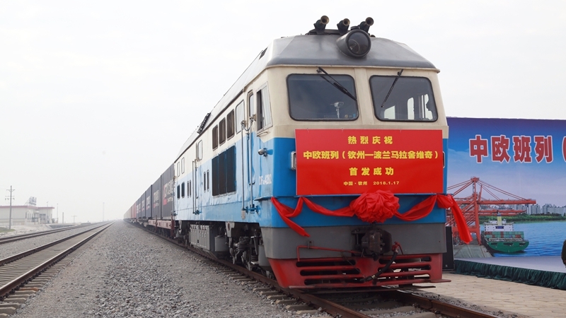 这是钦州港东站首趟中欧班列(钦州—波兰马拉舍维奇)的出发现场(2018年1月17日摄)。