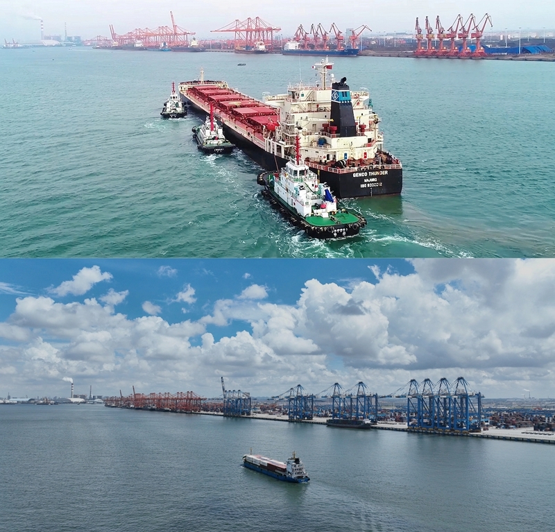 拼图照片:上图为2021年5月10日拍摄的钦州港,集装箱自动化码头尚未建设(无人机照片);下图为2023年11月24日拍摄的钦州港,集装箱自动化码头已投入运营(无人机照片)。