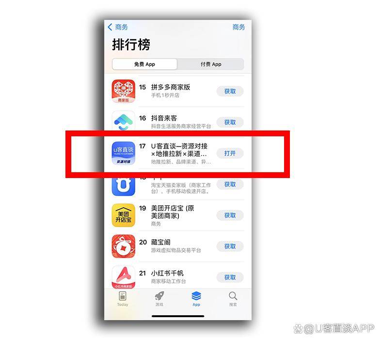 U客直谈是目前中文互联网最大的app拉新推广一手接单平台,在苹果应用商店,商务app免费排行榜中,U客直谈位列第17名。