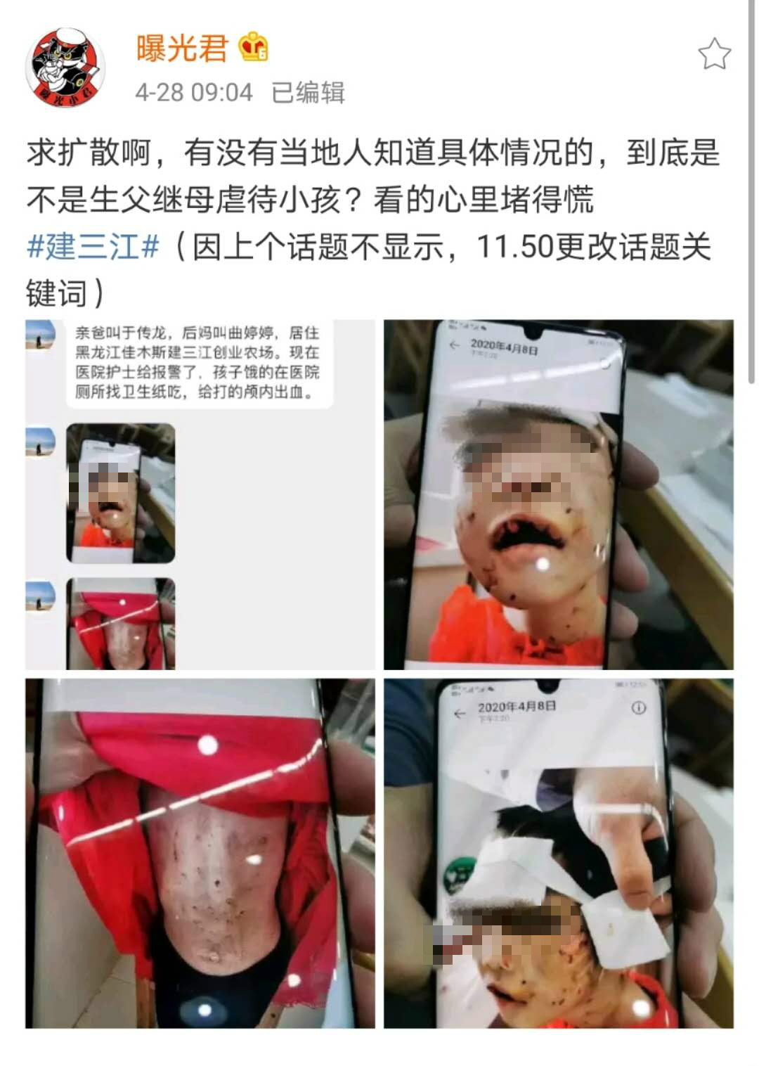 4月28日,有微博网友爆料称,黑龙江省佳木斯建三江创业农场一4岁女童疑被殴致颅内出血,“孩子继母用剪刀把孩子的嘴唇都剪掉了。”