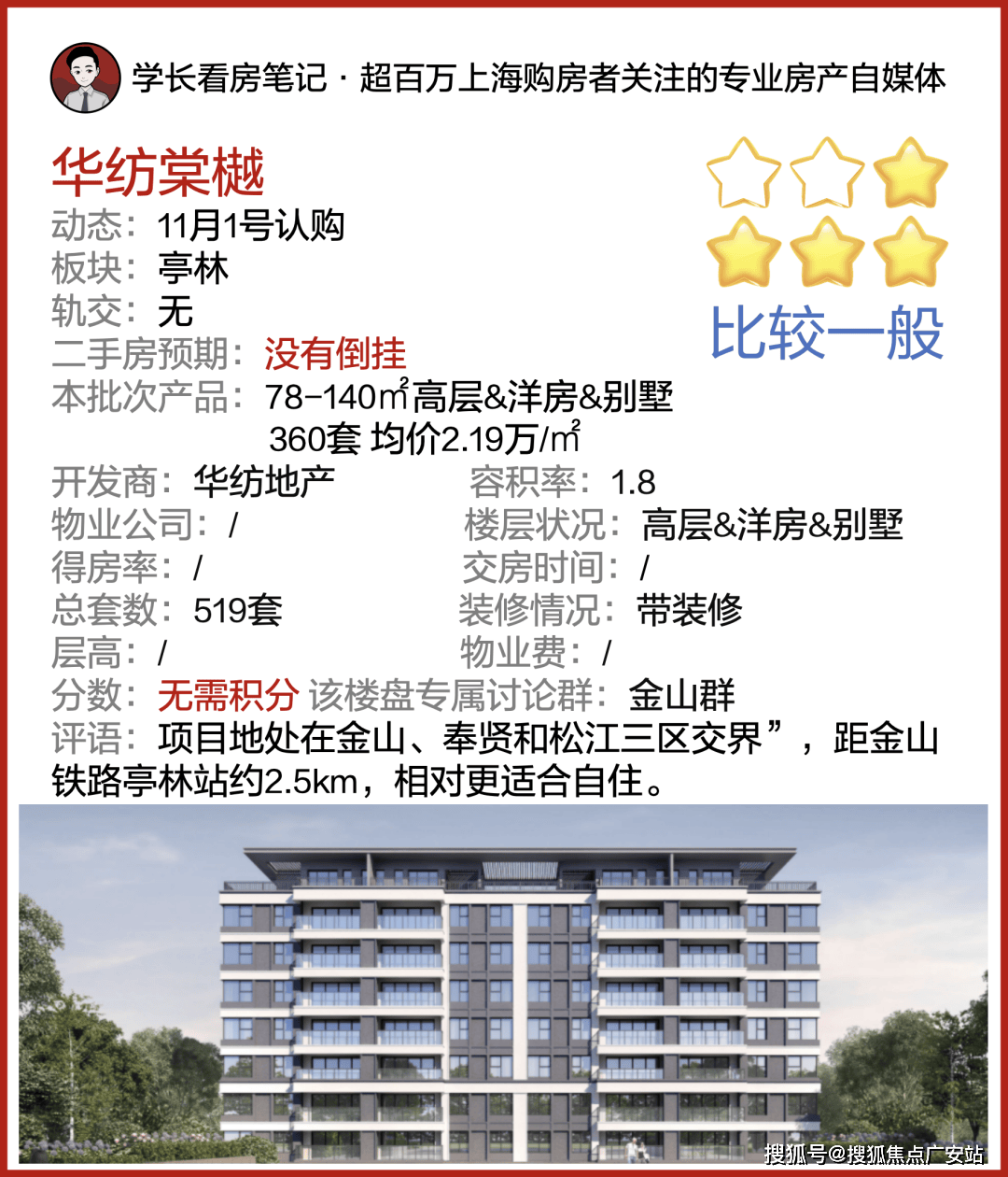 一房一价表发布!金山亭林「华纺棠樾」明天认购!约78-140㎡高层&洋房&别墅,均价约2.19万/㎡!