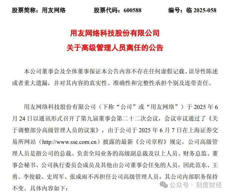 更引人关注的是,2025年6月24日,用友网络召开董事会,宣布范东、王勇、李俊毅、史周军、张成雨5名高级副总裁不再担任公司高级管理人员。