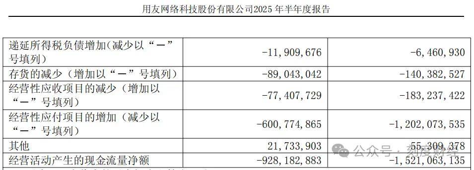 更大的问题在于公司经营现金流持续为负,从2023-2024年,用友网络的经营活动现金流量净额均为负数,2025年上半年仍净流出9.28亿元,流动负债净额达23.49亿元,资金链压力显著。